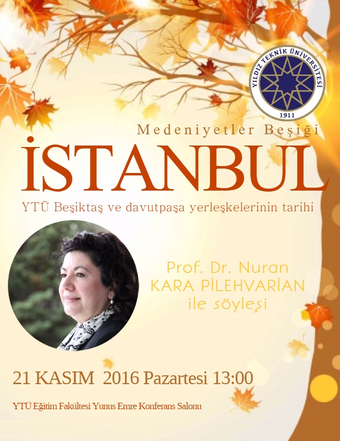 21 Kasım 2011 pazartesi, yani bugün saat 13:00'te Yunus Emre Konferans Salonunda Türkçe Eğitimi Bölümü öğrencileri tarafından hazırlanan "Medeniyetler Beşiği İstanbul" konulu bir program düzenlenecektir. Programın konuşmacısı Mimarlık Fakültesi öğretim üyesi Prof. Dr. Nuran KARA PİLEHVARİAN'dır.