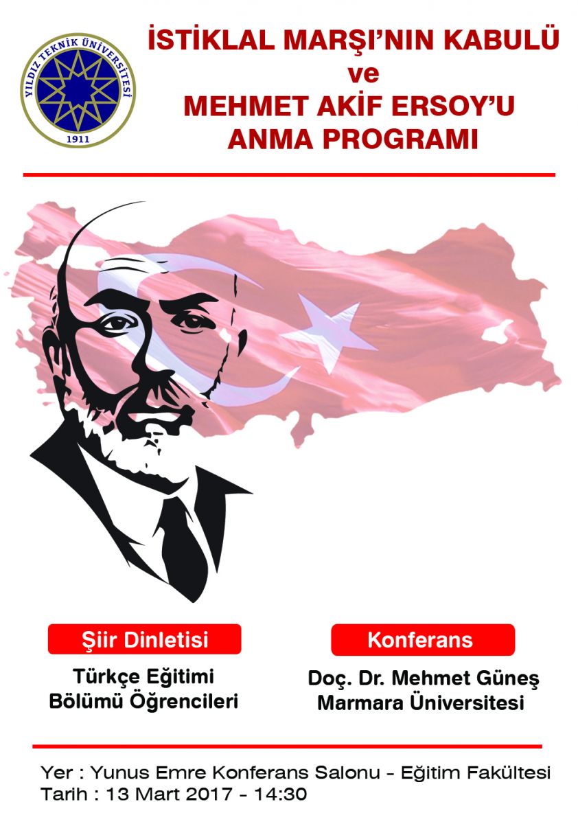 Bölümümüz Türkçe Eğitimi Anabilim Dalı tarafından 13 Mart 2017 Pazartesi günü saat 14:30'da Doç. Dr. Mehmet Güneş'in konuşmacı olarak katılacağı "İstiklal Marşı'nın Kabulü ve Mehmet Akif Ersoy'u Anma Programı" adlı etkinlik düzenlenecektir.